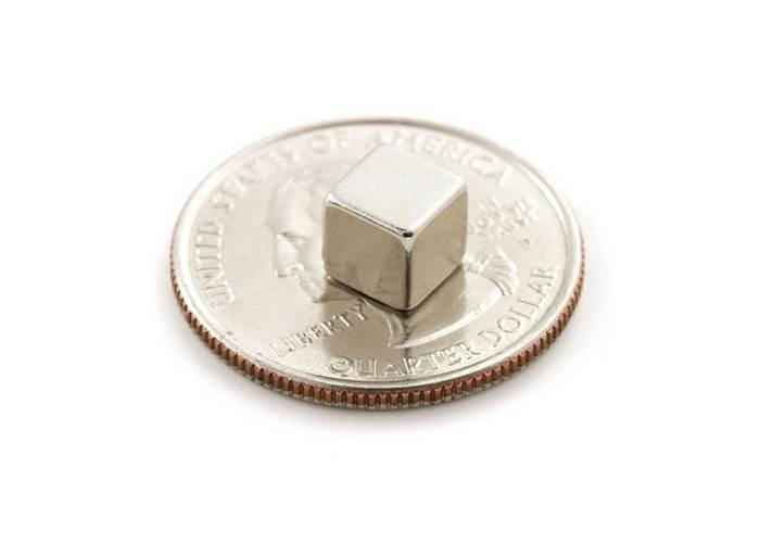 These are small rare earth magnets - 0.25" cubed. Composed of Neodymium/Iron/Boron (NdFeB), these magnets are curiously strong and make for a great way to attach tools to a metal workbench, hold small children to a fridge, and as a trigger for reed switches.