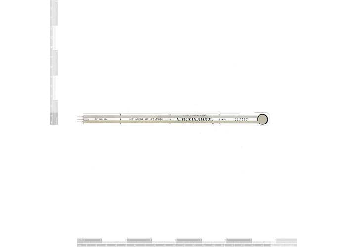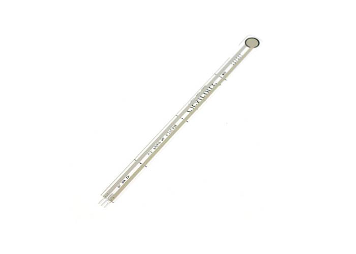 This is a piezoresistive force sensor from Tekscan. The harder you press, the lower the sensor's resistance. Pressing lightly, the resistance changes from infinite to ~300k. The sensor itself is thin and flexible, but the resistance does not change while being flexed. Resistance changes only when pressure is applied to the round area at the end of the sensor. Used as a presence sensor (someone standing), weight sensor, pressure sensor (impact testing), etc.