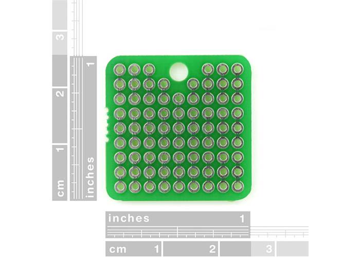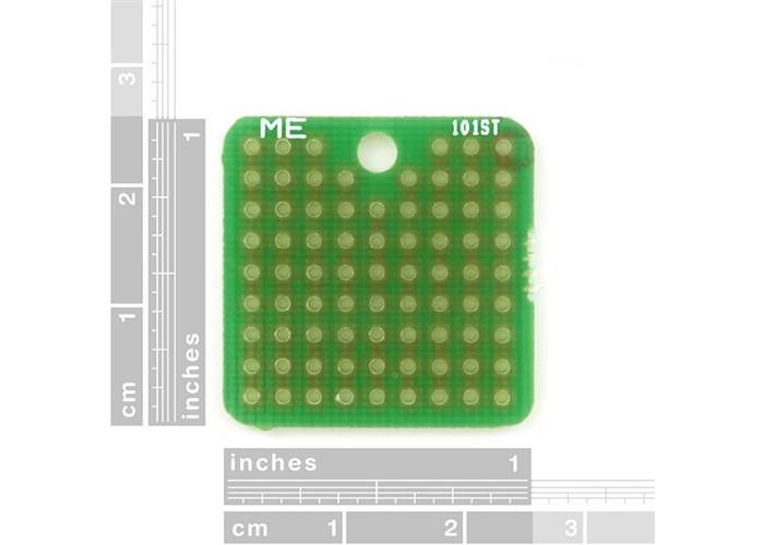 This is a very simple but extremely handy, 1" square, single sided perf board. Standard 0.1" spacing with a 4-40 (3mm) hole for mounting. Every three holes are connected with a 20mil trace.