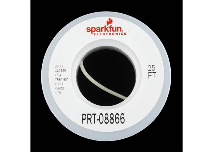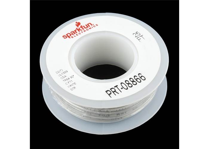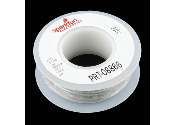 Standard 22 AWG stranded white wire. Use this for soldering wire or any project in which you need flexible wire. Stranded wire is recommended for projects where the wire has a bend or stress point. Comes in small spools of 25'.