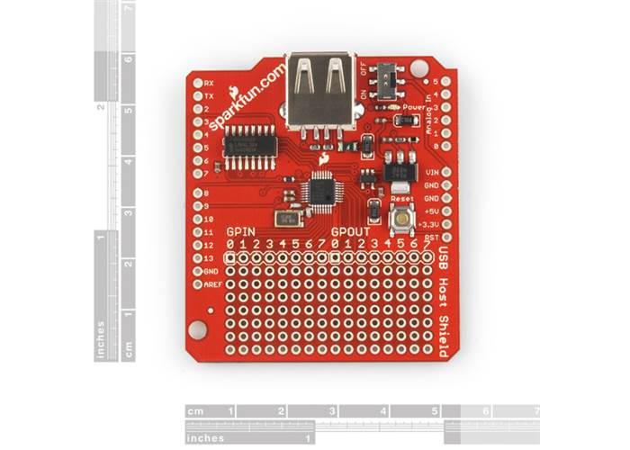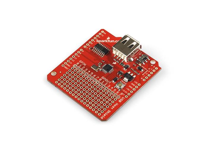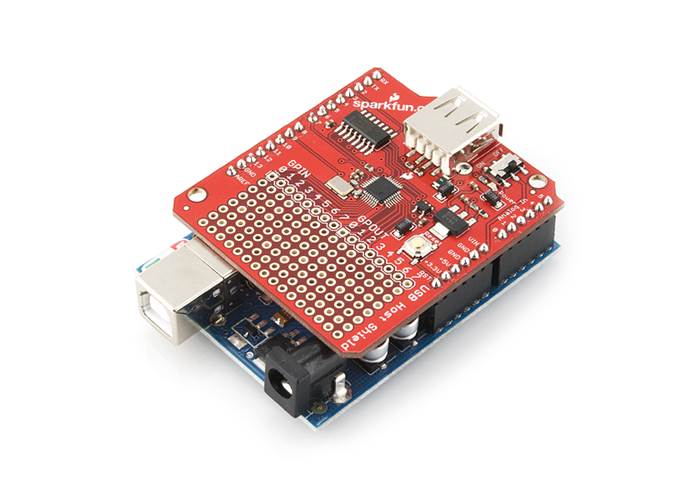 This new version corrects the pin out for the GPX and RESET pins. The SparkFun USB Host Shield contains all of the digital logic and analogue circuitry necessary to implement a full-speed USB peripheral/host controller with your Arduino. This means you could use your Arduino to interface with and control any USB slave device - thumbdrives, digital cameras, bluetooth dongles, and much more!