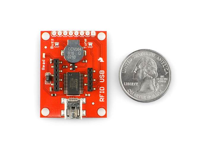 The SparkFun RFID USB Reader is a simple to use, USB to serial base unit for the ID-3LA, ID-12LA, and ID-20LA readers. Simply plug a reader into the headers and attach a miniUSB cable. Open a terminal program of your choice at 9600bps 8N1, then scan your 125kHz ID tag and the unique 32-bit ID will be shown on the screen. The unit is based on a FTDI chip and comes with a read LED and buzzer.