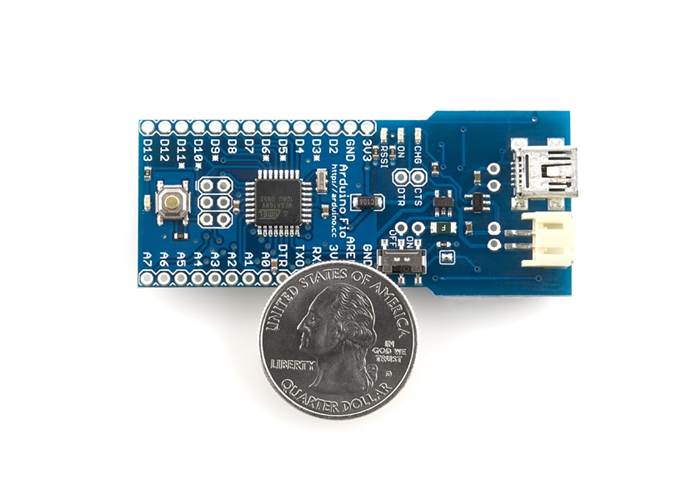 The Arduino Funnel I/O (Fio) is a board designed by Shigeru Kobayashi, based on the original design from LilyPad.