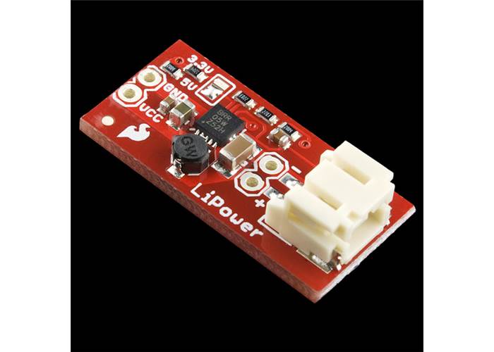 The LiPower board is based on the incredibly versatile TPS61200 boost converter. The board is configured to be used with a LiPo battery has solder jumper selectable 5V and 3.3V output and an under voltage protection of 2.6V.