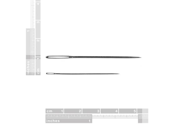 This set of sewing needles is a must-have when stitching together your next e-textile project. Each envelope contains three 48mm, 1.23mm thick needles and two smaller 39mm, 0.67mm thick needles. The eye of each size needle is large enough to easily thread with our conductive thread.