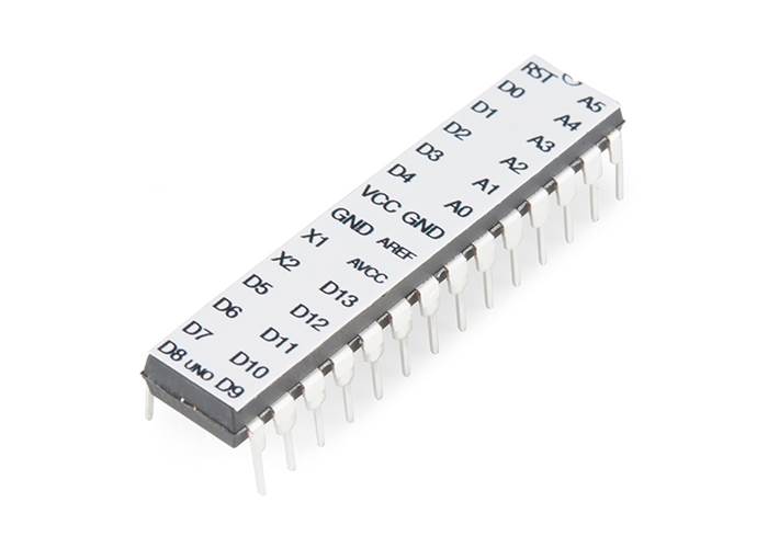 Atmel's ATMega328 8-Bit Processor in 28 pin DIP package. It's like the ATmega168, with double the flash space. 32K of program space. 23 I/O lines, 6 of which are channels for the 10-bit ADC. Runs up to 20MHz with external crystal. Package can be programmed in circuit. 1.8V to 5V operating voltage!