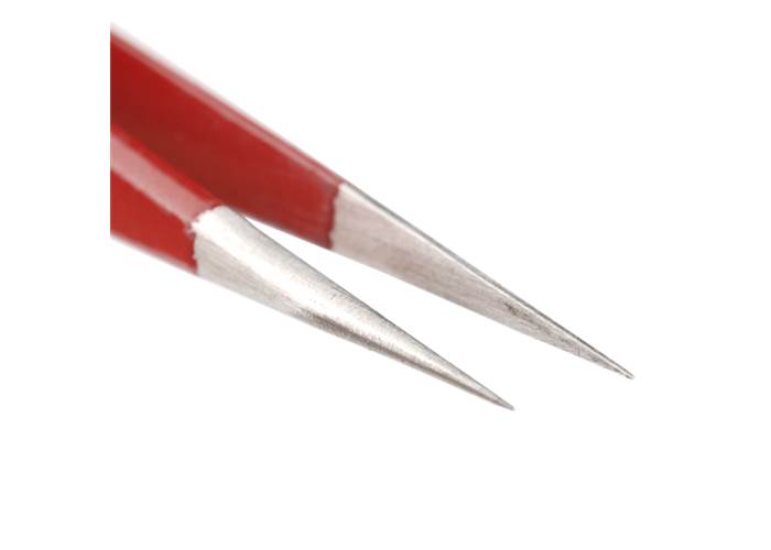 These are nice, solid straight tweezers. They have a very fine tip which allows you to pick up very small parts with precision. This is a great tool to have if you're working with surface mount components or anything with very small parts. The ESD-safe coating will also help prevent electro-static damage to sensitive electronic components. The best part? They're bright red and have the SparkFun logo printed right on them!
