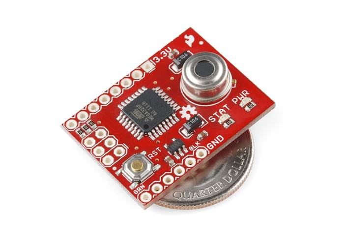 The MLX9061 sensor is a high precision, small size, single zone IR thermometer with an optional SMBus (two-wire) or PWM interface. The ATMega328 comes with demo code that gives a temperature readout in degrees F at 38400bps. You can use a 3.3V FTDI Basic to connect to the board.