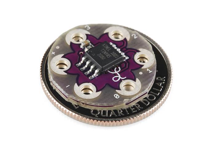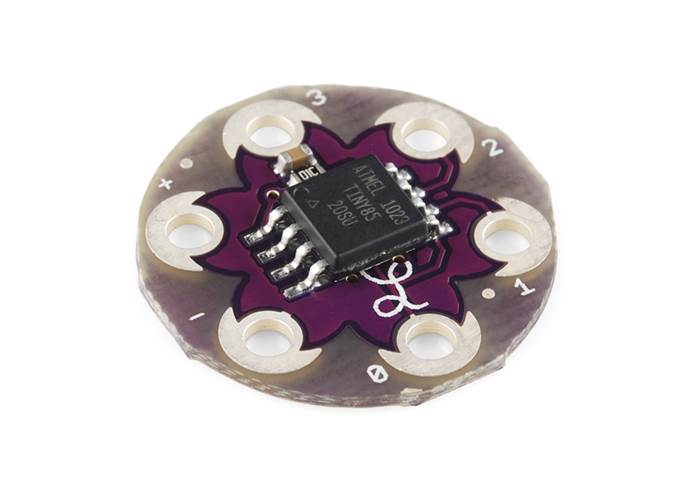 The LilyTiny is a tiny little LilyPad board designed to add flashy functionality to your project without taking up a lot of room. Even though it's as small as some of the LilyPad sensors, this board actually has an ATtiny microcontroller on it so it's actually pretty smart! Simply sew on four LEDs and connect a battery and the LEDs will each blink or fade differently. One will blink on and off (2), another will flash a heartbeat pattern (1), another will do a "breathing" fade (0) and the other will do a random fade (3). LilyTiny is a quick and easy way to add twinkling lights to a project without any programming or a bulky Main Board. It's also a great educational tool for showing a range of functionality without having to get out the computers.