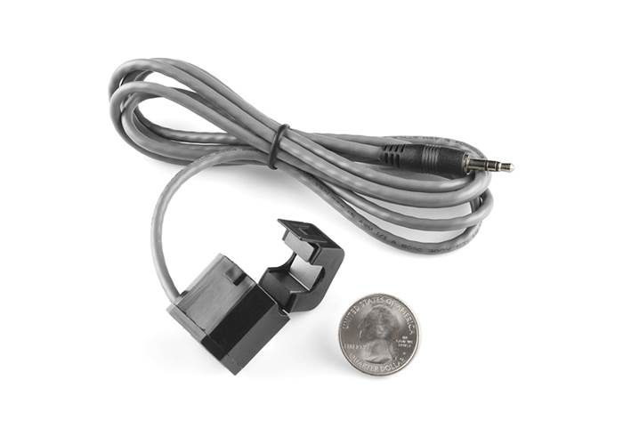 This non-invasive current sensor (also known as a "split core current transformer") can be clamped around the supply line of an electrical load to tell you how much current is passing through it. It does this by acting as an inductor and responding to the magnetic field around a current-carrying conductor. By reading the amount of current being produced by the coil, you can calculate how much current is passing through the conductor.