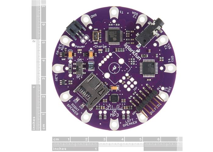 The LilyPad MP3 Player is your all-in-one audio solution, containing an Arduino-compatible microcontroller, MP3 (and many other formats) audio decoder chip, micro-SD card socket, and a stereo audio amplifier. Part of the Lilypad E-textiles line, this board can be used to give your fabric creations the gift of music, or any other sounds you can put on a micro-SD card.