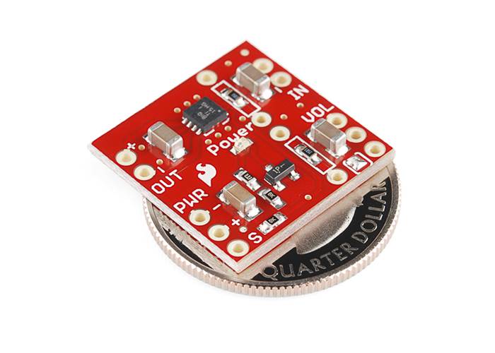 The fully-differential inputs are safe for floating audio signals such as from our MP3 Shield, and can also be connected to ground-referenced signals as well. A shutdown input is provided to save power when the amplifier is not being used, and a solder jumper and header are provided to connect a volume-control potentiometer (not included).