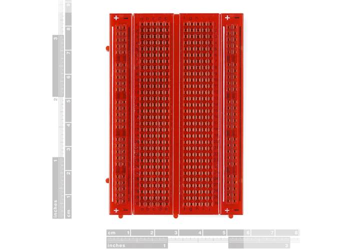 This translucent red breadboard is probably the coolest looking regular, solderless breadboard there is. It has 2 power buses, 30 columns, and 10 rows - a total of 400 tie in points. All pins are spaced by a standard 0.1". The two sets of five rows are separated by about 0.3", perfect for straddling a DIP package over. The board accepts wire sizes in the range of 29-20AWG.