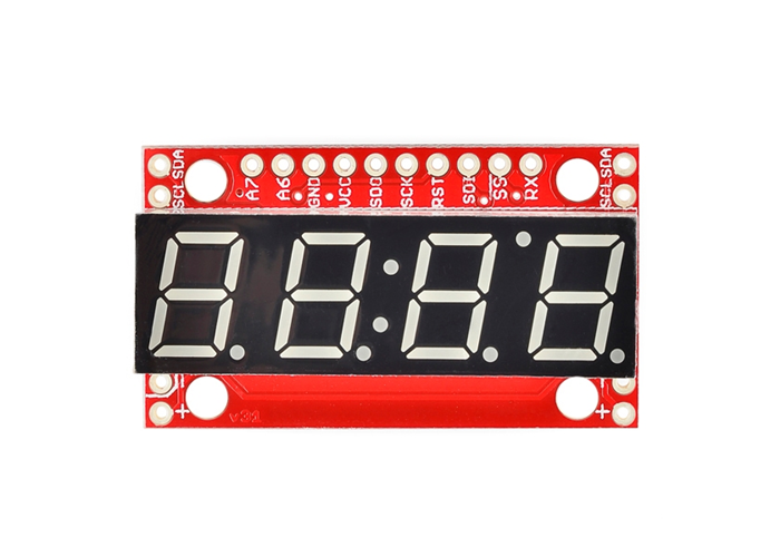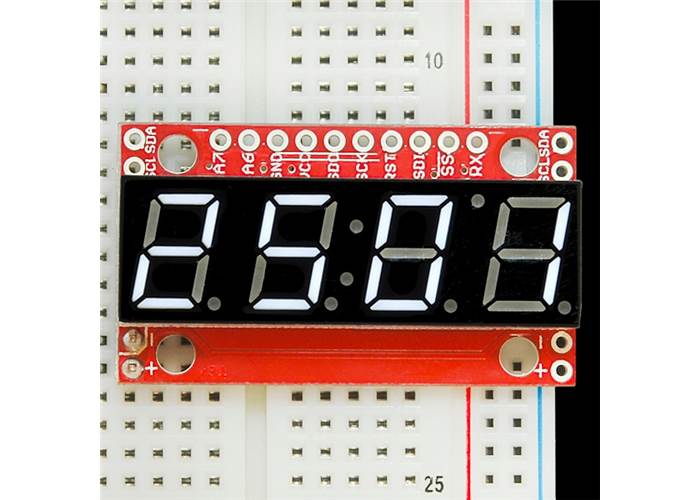 4-digit 7-segment displays are really neat little devices, it's a shame that they can be so cumbersome to control. Well we've solved that problem by making them a little bit "smarter." The SparkFun 7-Segment Serial Display combines a classic 4-digit 7-segment display and an ATMega328 microcontroller allowing you to control every segment individually using only a few serial lines.
