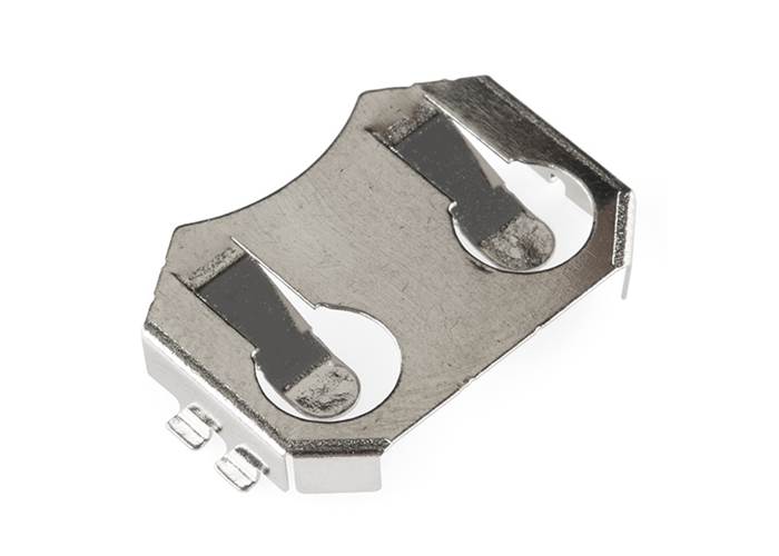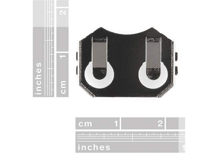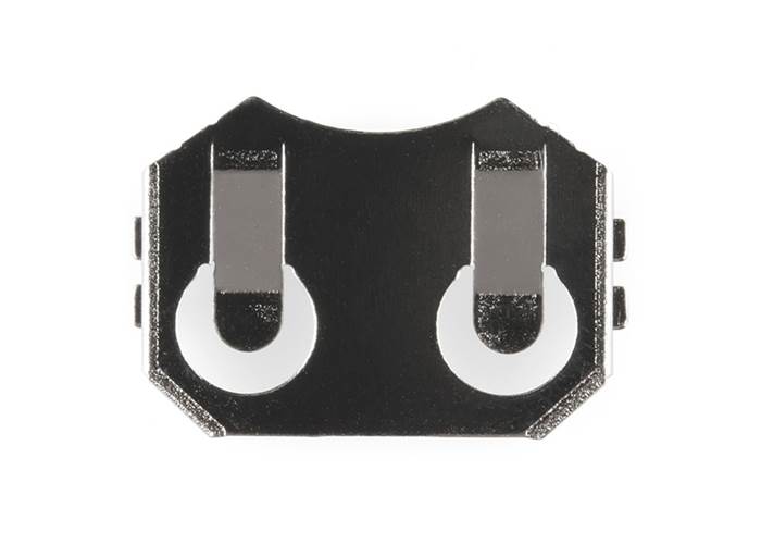 Now for all of your coin cell battery surface mount needs, the 20mm SMD Coin Cell Holder. This holder fits our 20mm Lithium Ion coin cell battery and holds the battery in place with friction. The metal housing connects to the positive (+) side of the battery and the PCB pad underneath is connected to the negative (-) side.