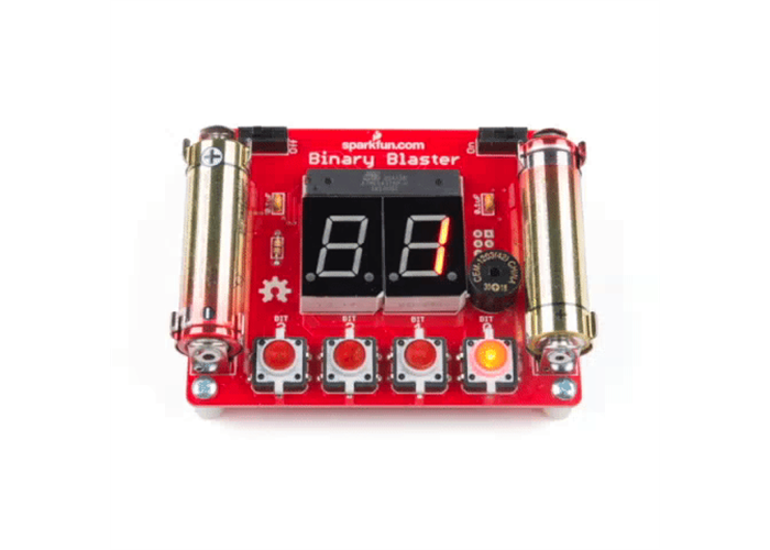 Binary Blaster is a game designed to help teach what binary numbers are and how to convert from decimal (and hexadecimal) to binary quickly. The game displays a value on the dual 7-segment displays, and the player is challenged to press the buttons in a way that represents the binary equivalent. Pressing a specific button allows a player to “set” that bit while leaving a button alone leaves the bit “clear”. There are four buttons on the Binary Blaster, each one represents a bit giving the player 15 different binary number possibilities. If the player gets all 15 correct, they win! Additionally, each blaster also displays a time score after each game, giving the player the ability to keep track of their fastest speed and practice to get even faster!