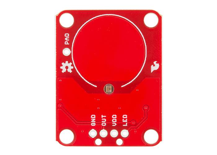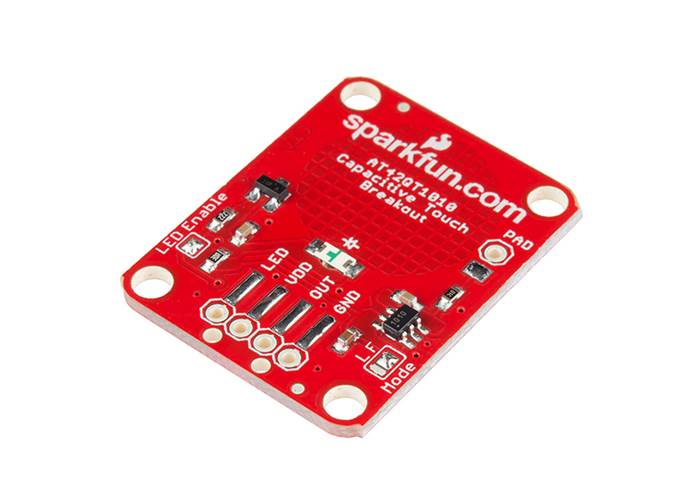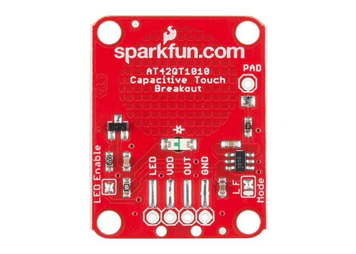 The AT42QT1010 is a dedicated, single-button capacitive sense chip. The chip handles monitoring a conductive area for touch. As long as a touch (e.g. from a finger) is detected, the AT42QT1010 keeps the output line high. Otherwise, the line is kept low. You just need to provide a power source (1.8V - 5V) and ground for the AT42QT1010 to work. Additionally, a PAD pin is available if you would like to create your own external electrode.