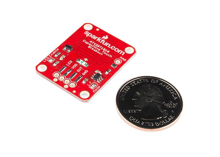 If you need to add user input without using a button, then a capacitive touch interface might be the answer. The AT42QT1010 SparkFun Capacitive Touch Breakout offers a single capacitive touch button with easy-to-use digital I/O pins.