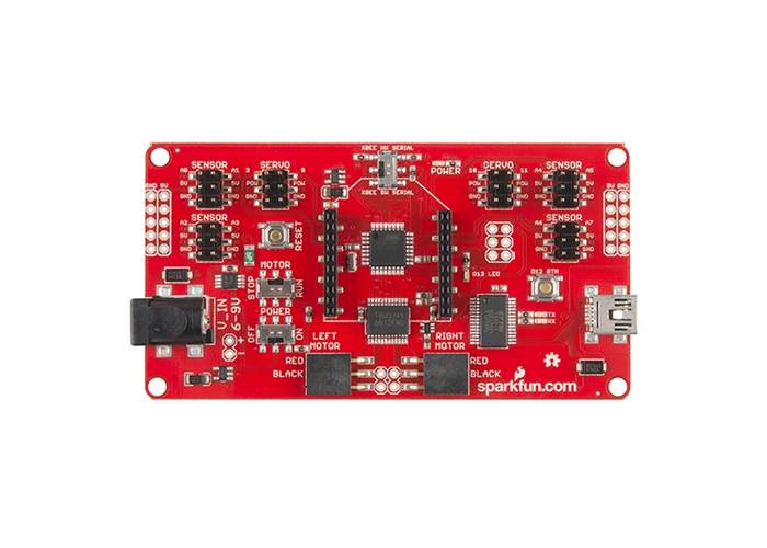 The SparkFun RedBot Mainboard is a robotic development platform that works with the Arduino IDE. The RedBot is a motor driver and Ardiuno combination with various headers and connections, eliminating the need to stack multiple shields. By using the RedBot accessory boards and your own chassis, you can design a robot to suit your needs.