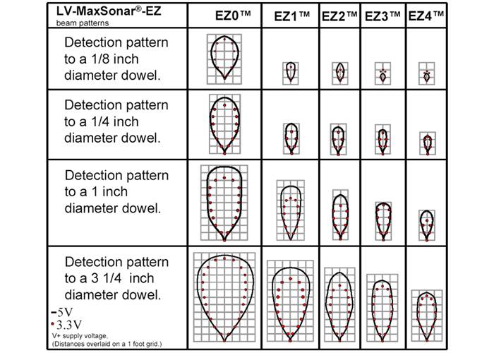 Since there are 15 members of the XL- and LV-MaxSonar acoustic distance sensor family, we recommend using the Maxbotix sonar range finder selection guide when choosing a acoustic range sensor for your application. There are 5 different beam configurations for the LV-MaxSonar family (EZ0 – EZ4), each pictured below.