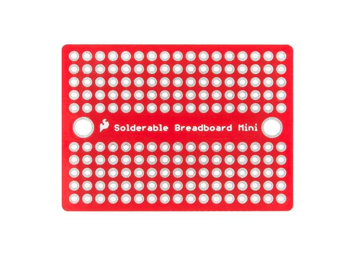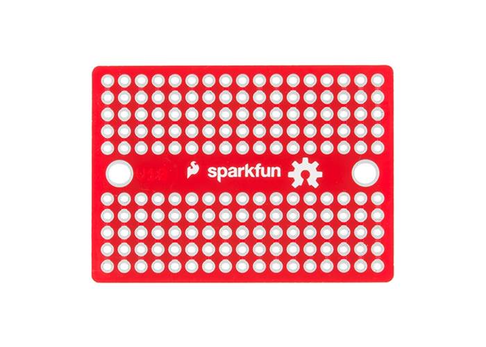 This is the Mini SparkFun Solder-able Breadboard. A bare PCB that is the exact size as our mini modular breadboards with the same connections to pins. This board is especially useful for preserving a prototype or experiment you just created on a solderless breadboard by soldering all the pieces in place.