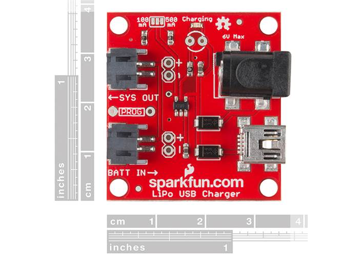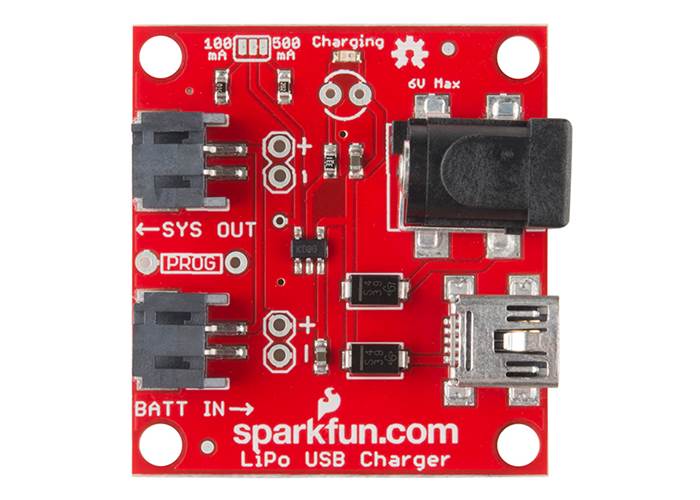 If you need to charge LiPo batteries, this simple charger will do just that, and do it fast! The SparkFun USB LiPo Charger is a basic charging circuit that allows you to charge 3.7V LiPo cells at a rate of 500mA or 100mA. It is designed to charge single-cell Li-Ion or Li-Polymer batteries.