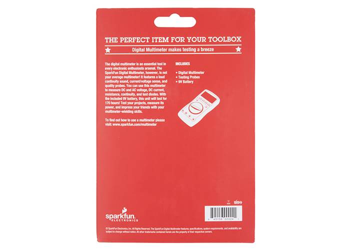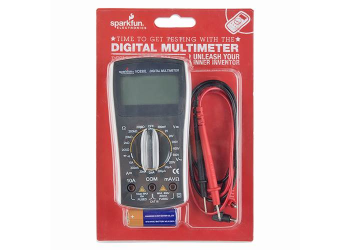 The digital multimeter (DMM) is an essential tool in every electronic enthusiasts arsenal. The SparkFun Digital Multimeter however is not your average multimeter it features a loud continuity sound current/voltage sense and quality probes.