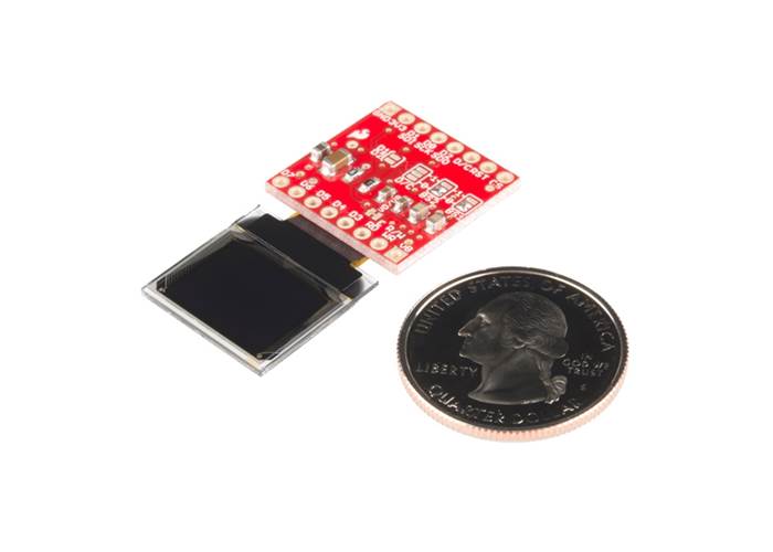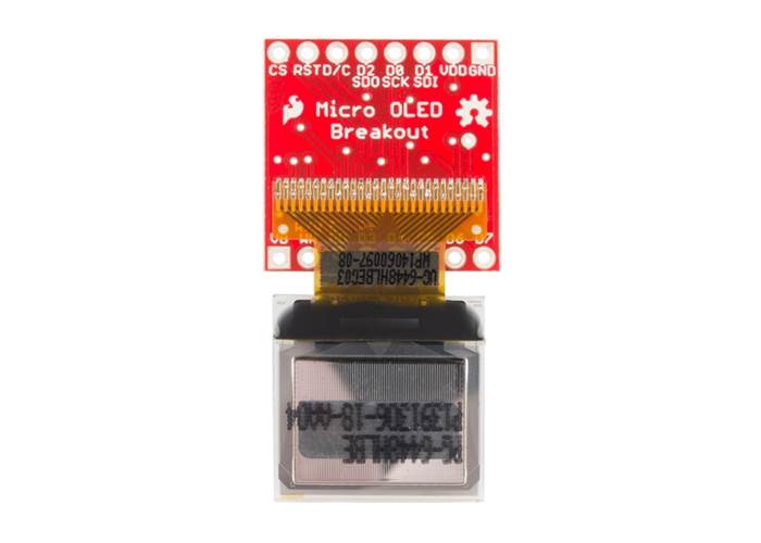 The SparkFun Micro OLED Breakout Board breaks out a small monochrome blue-on-black OLED. It’s "micro" but it still packs a punch – the OLED display is crisp and you can fit a deceivingly large amount of graphics on there.