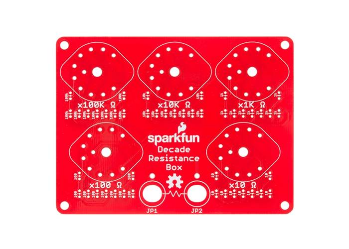This is the SparkFun Decade Resistance Box, an involved PTH soldering kit that allows you to quickly and accurately dial in a specific resistance value between 0 and 999,990 Ω, in 10 Ω increments. The concept is simple, a decade box is a tool that contains resistors of many values that can be accessed via mechanical switches. All you need to do is just adjust the knobs to output any of the discrete resistances offered by the box. Once assembled, each kit will have controls that correspond to the digits in a decimal number - a control for the tens position, a control for the hundreds position, and so on.