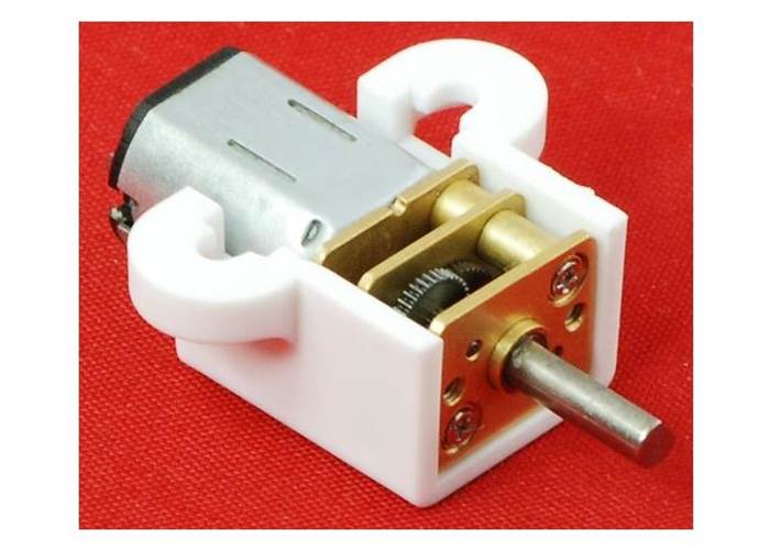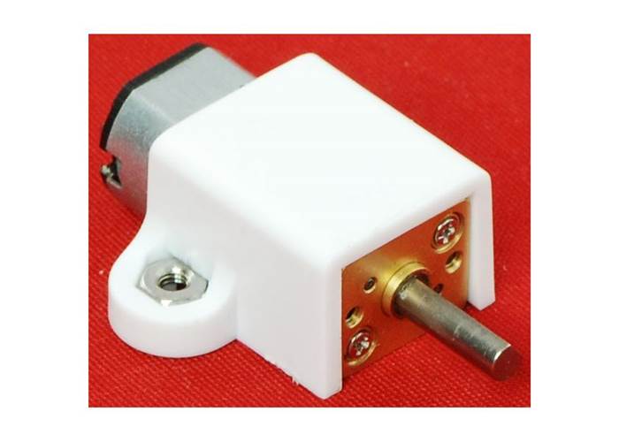 This compact bracket enables convenient mounting of popular, Sanyo-style micro metal gearmotors . The white plastic bracket encloses the otherwise exposed gears, and the mounting tabs capture the nuts for easy installation.