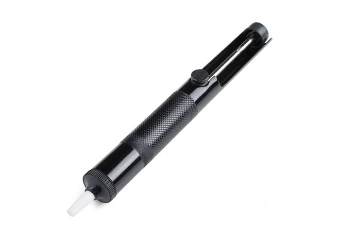 This solder vacuum has a black metal body with a hard plastic nozzle and buttons.