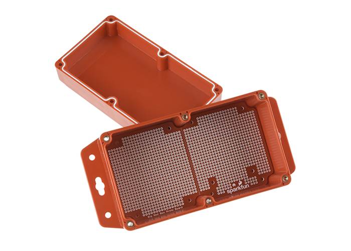 Each SparkFun Big Red Box Proto Board is equipped with ten mounting holes to secure it inside the enclosure. The proto board can even be broken in half at the V-score that runs down the middle to use only half or, with addition of some standoffs, can be stacked on top of one another. Either option will require some 1/4" 4-40 screws.