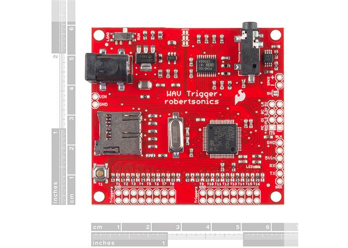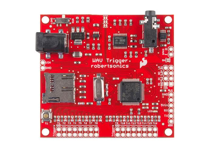 The WAV Trigger is a unique high-fidelity polyphonic audio player with surprising capabilities. Supporting up to 2048 uncompressed 16-bit, 44.1kHz wav files – the same quality as an audio CD – the WAV Trigger can play and mix up to 14 stereo tracks simultaneously and independently, with very low latency. Tracks can be controlled via 16 programmable trigger inputs, or by using a native serial control protocol or even MIDI.