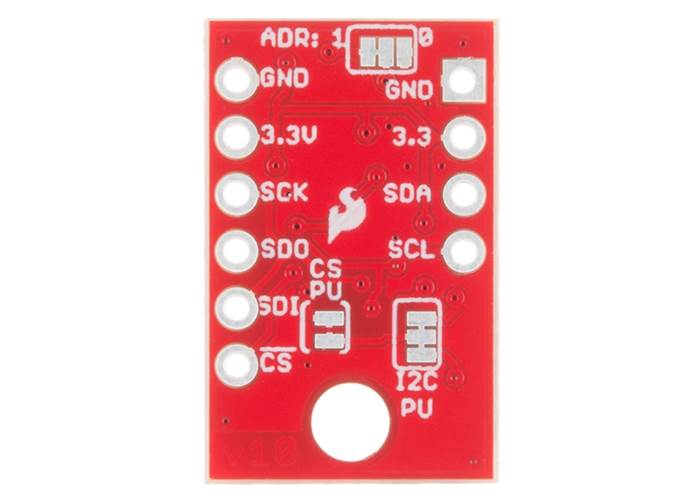 The on-board BME280 sensor measures atmospheric pressure from 30kPa to 110kPa as well as relative humidity and temperature. The breakout provides a 3.3V SPI interface, a 5V tolerant I2C interface (with pull-up resistors to 3.3V), takes measurements at less than 1mA and idles less than 5µA. The BME280 Breakout board has 10 pins, but no more than six are used at a single time. The left side of the board provide power, ground, and I2C pins. The remaining pins which provide SPI functionality and have another power and ground, are broken out on the other side.