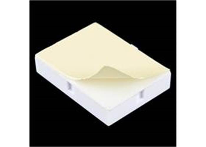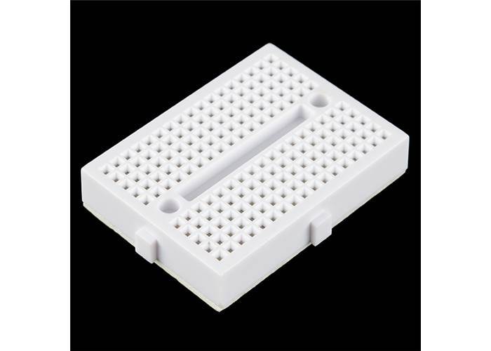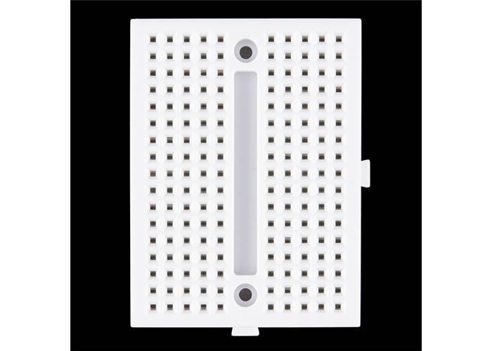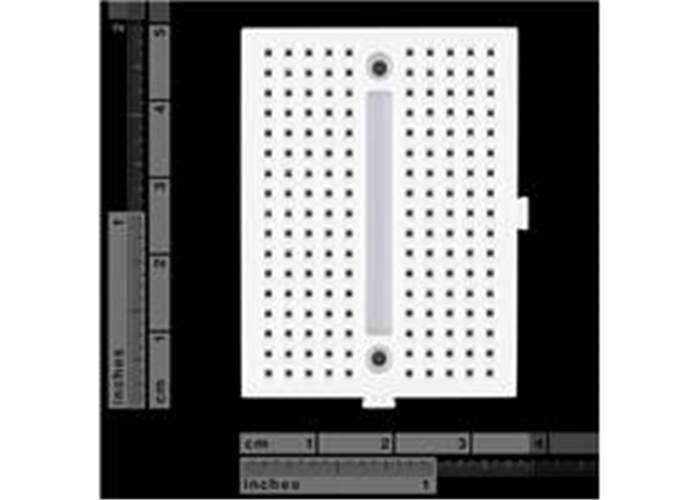This 47 × 35 mm (1.84 × 1.37") solderless breadboard has 17 rows of tie points, enough for up to two 14- or 16-pin DIP ICs. Although it is difficult to see in the pictures, the rows and columns are conveniently labeled. The board features an adhesive backing and two mounting holes, and tabs allow multiple units to be connected for larger projects. This breadboard is a traditional white; other colors are also available.