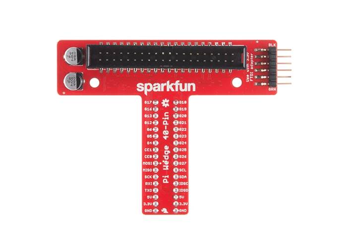 This is the SparkFun Pi Wedge, a small board that connects to the 40-pin GPIO connector on the Raspberry Pi and breaks the pins out to breadboard-friendly arrangement and spacing, and even adds a couple of decoupling capacitors on the power supply lines. The "Wedge" also makes the initial bring-up process easier - you can plug an FTDI Basic module into the built-in serial port. Each version of this Pi Wedge comes preassembled and can be inserted into the RPi's GPIO port that allows you to prototype - no soldering required!
