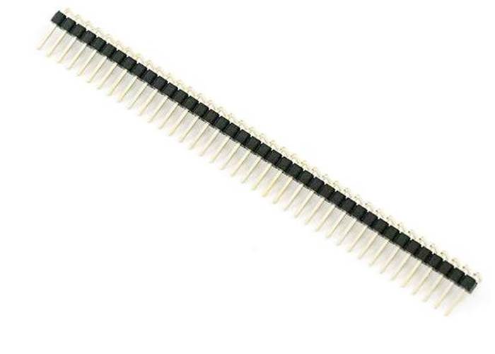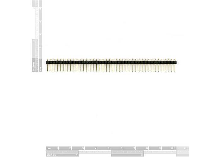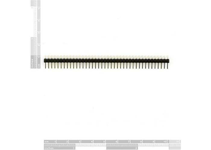 A row of right angle male headers - break to fit. 40 pins that can be cut to any size. Used with custom PCBs or general custom headers.Features:Pin Style: Square PinsNumber of Pins: 40Pin Spacing: 0.1" (2.54 mm)Pin Length: 10.25 x 4.5 mm