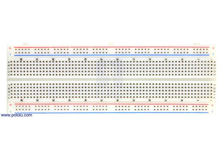 This 6.5" x 2.125" solderless breadboard has four bus lines each spanning the length of the board, and 63 rows of pins, enough for up to nine 14-pin DIP ICs or seven 16-pin DIP ICs.