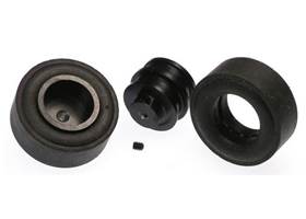 The Solarbotics RW2 rubber wheel has a black, anodized aluminium hub with a generously thick rubber tyre for maximum traction (great for minisumo robots or fast line-following robots that need traction when rounding corners).