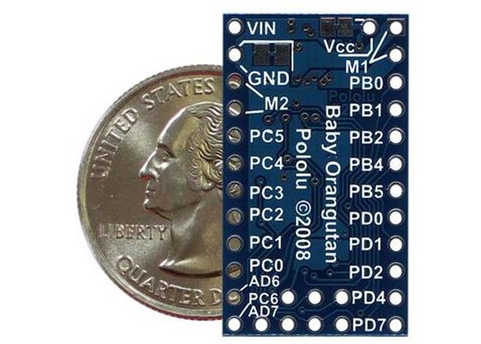 The Baby Orangutan B-328 is a very compact but complete robot controller, packing a high-performance ATmega328P AVR microcontroller (with 32 KB of program memory and 2 KB of RAM) and two motor drive channels in the same 24-pin form factor as competing units that include just a microcontroller. You can connect your battery, sensors, and motors directly to this small module to make a miniature robot, or you can use the Baby Orangutan as an auxiliary controller in larger robots.