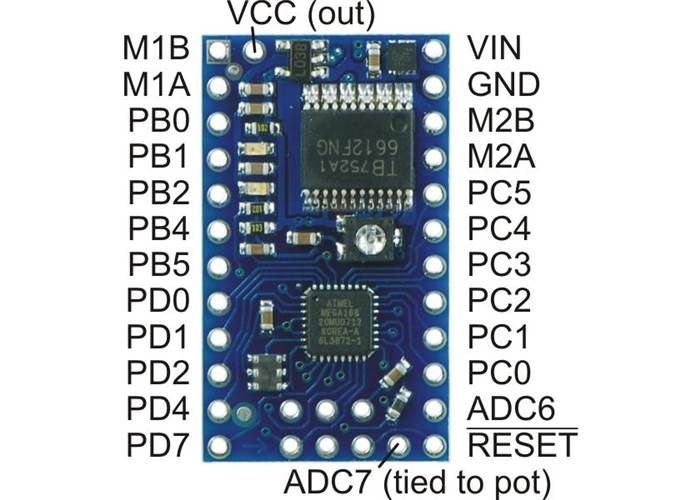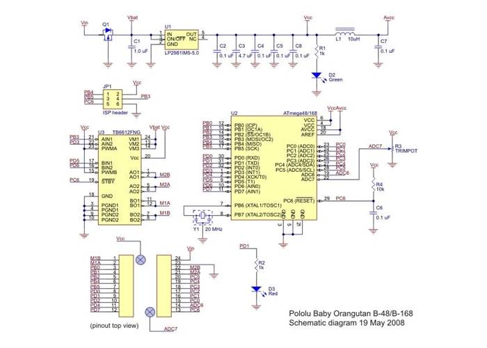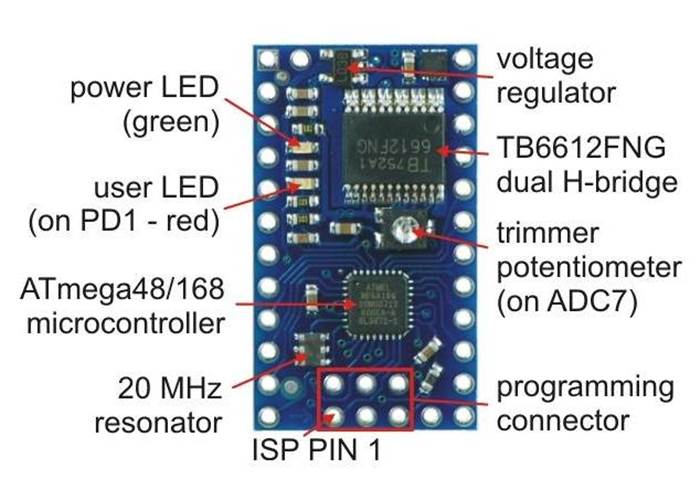 • pinout is compatible with the Orangutan SV-328 and 3pi robot, so the same code will generally work on all of these devices