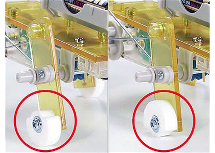 Motor rotation is transferred to the legs via crank plates and linkage rods, causing the Mechanical Dog to walk. The dog’s stride depends on the crank holes to which the front legs are attached, which means there are four possible strides for you to choose from. Put this together with the two possible gear ratios and you’ve got an 8-speed puppy. Gripping parts at the end of each leg to change position according to speed for smooth movement. The body is made from a transparent yellow ABS resin that allows you to see all of the motors, gears, cranks, and linkage rods in action.