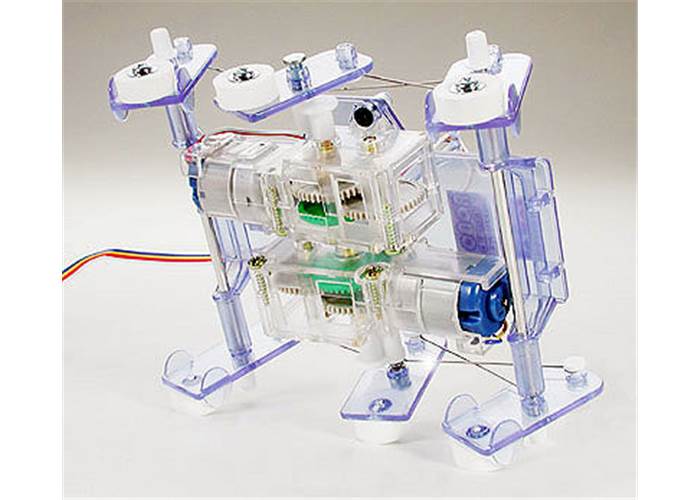 All the parts needed to construct a Mechanical Insect and the 2-channel remote control are provided. This robot kit is equipped with two gearboxes, one that controls the right legs and one that controls the left legs. While working in the same direction, the gearboxes allow your robot to move forward or backward. While working in opposite directions, the gearboxes allow your robot to turn right or left. The remote control allows you to control the two gearboxes; each lever controls one gearbox. After some practice, you will be able to make your insect go anywhere you want. The Mechanical Insect’s body is made from a transparent blue ABS resin that allows you to see all of the motors, gears, cranks, and linkage rods in action.