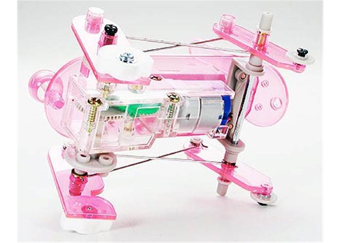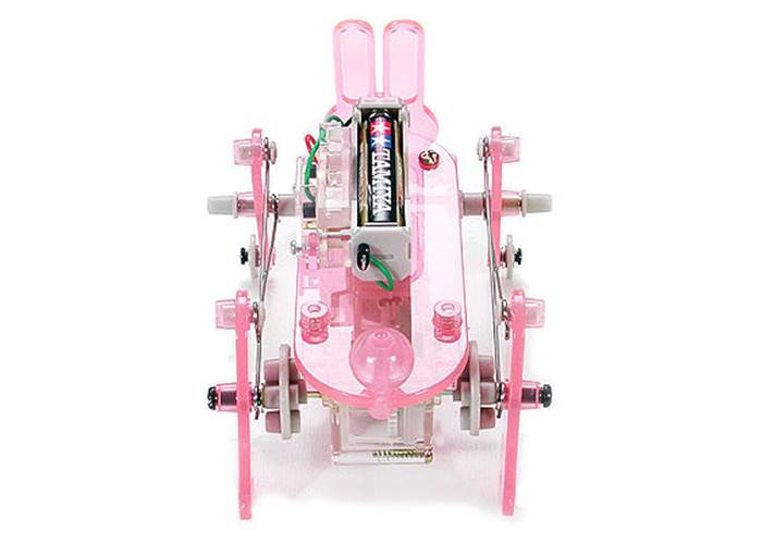 Motor rotation is transferred to the legs via crank plates and linkage rods, causing the rear legs kick the robot forward in a hopping motion. As more of the weight is supported by the front legs, rollers attached to the feet eliminate the friction that would result from this extra load. The Mechanical Rabbit’s body is made from a transparent pink ABS resin that allows you to see all of the motors, gears, cranks, and linkage rods in action.