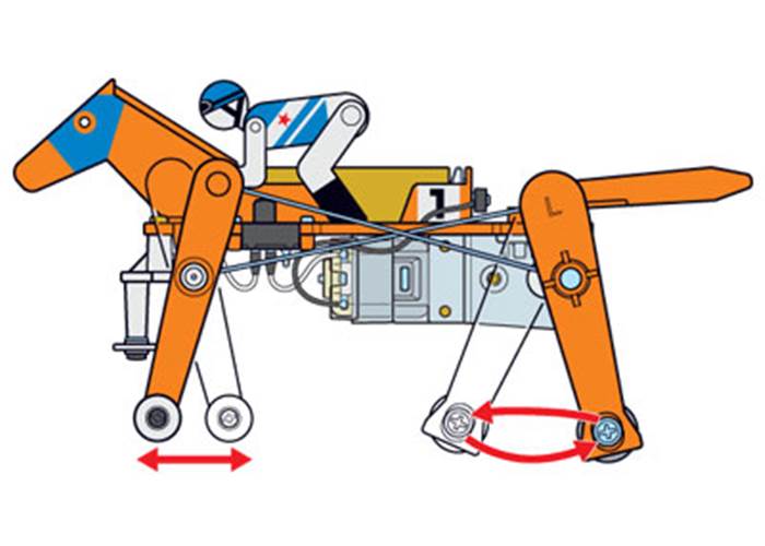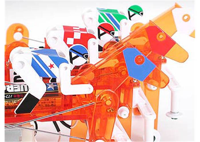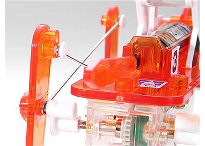 Motor rotation is transferred to the legs via cranks and linkage rods, causing the Mechanical Racehorse to gallop. Two linkage rod holes on the rear legs allow you to choose between two running styles. The mechanical horse is comprised of mainly transparent orange plastic, which allows you to easily see the internal mechanics in action.