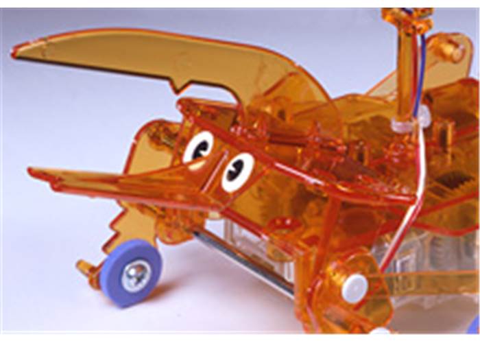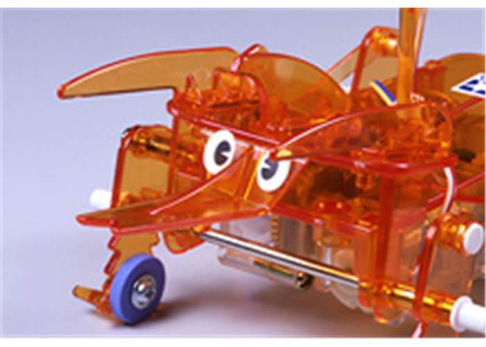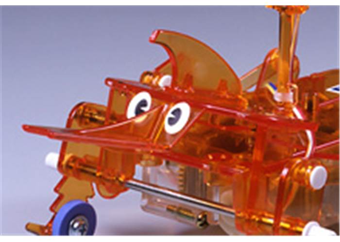 The beetle’s legs are connected by plastic linkage rods that produce a six-legged walking gait when the motors are running. The horned head parts are linked to the right front leg, which causes them to move up and down as the beetle walks. The Rhinoceros Beetle’s body is made from a transparent orange ABS resin that allows you to see all of the motors, gears, cranks, and linkage rods in action.