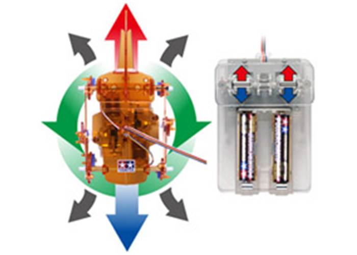 The Rhinoceros Beetle is equipped with two gearboxes, one that controls the right legs and one that controls the left legs. While working in the same direction, the gearboxes allow your robot to move forward or backward. While working in opposite directions, the gearboxes allow your robot to turn right or left. The remote control allows you to control the two gearboxes; each lever controls one gearbox. After some practice, you will be able to make your beetle go anywhere you want.