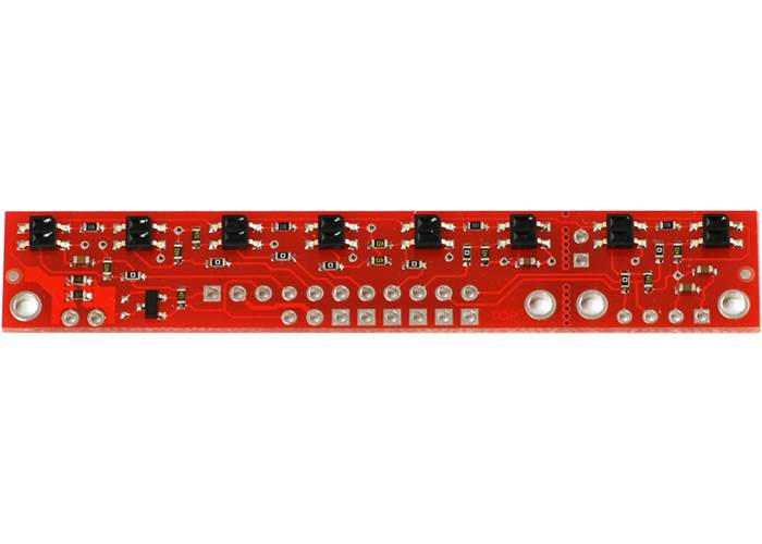 This sensor module has 8 IR LED/phototransistor pairs mounted on a 0.375" pitch, making it a great detector for a line-following robot. Pairs of LEDs are arranged in series to halve current consumption, and a MOSFET allows the LEDs to be turned off for additional sensing or power-savings options.