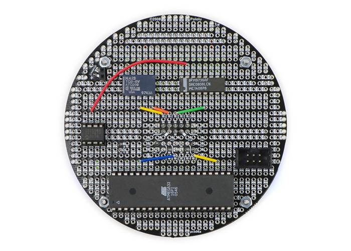 The expansion PCB matches the diameter of the 3pi chassis and mounts just above the tops of the wheels using the four included screws and spacers. Once assembled, the PCB has electrical connections to the base that allow you interface your own electronics with the 3pi robot, which is sold separately. These connections give you access to the ATmega168’s LCD pins, ISP programming pins, and free/jumpered pins, as well as to the three on-board voltages: VBAT (battery voltage), VCC (regulated 5 V), and VBST (regulated 9.25 V that is supplied to the motors). Additionally, the expansion PCB connects to the base’s power button and battery charge port, allowing you to add your own power buttons and charge ports.