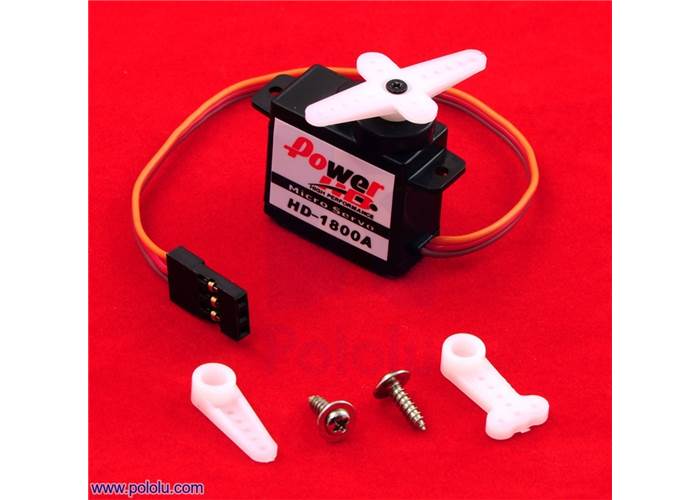 The HD-1800A analogue servo from Power HD is a great general-purpose micro servo at a great price. Servo horns and associated hardware are included. Key specs at 6 V: 0.08 sec/60°, 18 oz-in (1.3 kg-cm), 8.0 g.